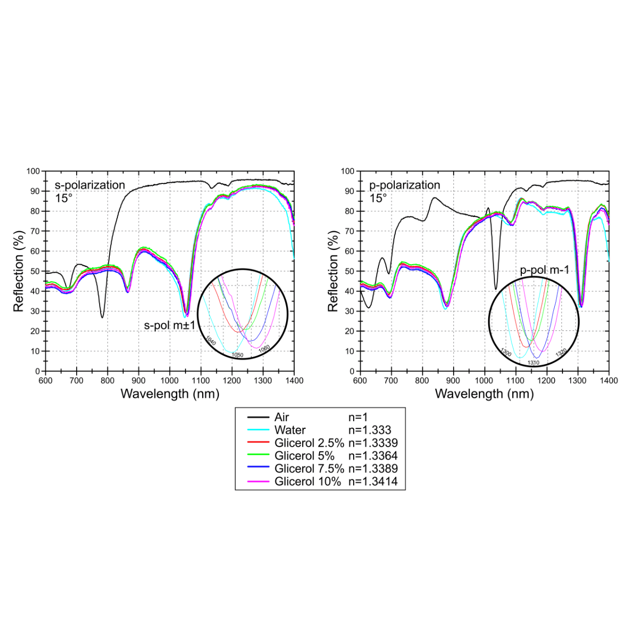 Below is the reflectance spectrum for s- and p-polarized light incident on the sensor at an angle of 15 degrees in air, water and solutions of different concentrations of glycerol (a thick transparent liquid). From the measured peak shift, it is possible to determine the presence of the molecules to be tested at the surface of the sensor and to calculate their concentrations.