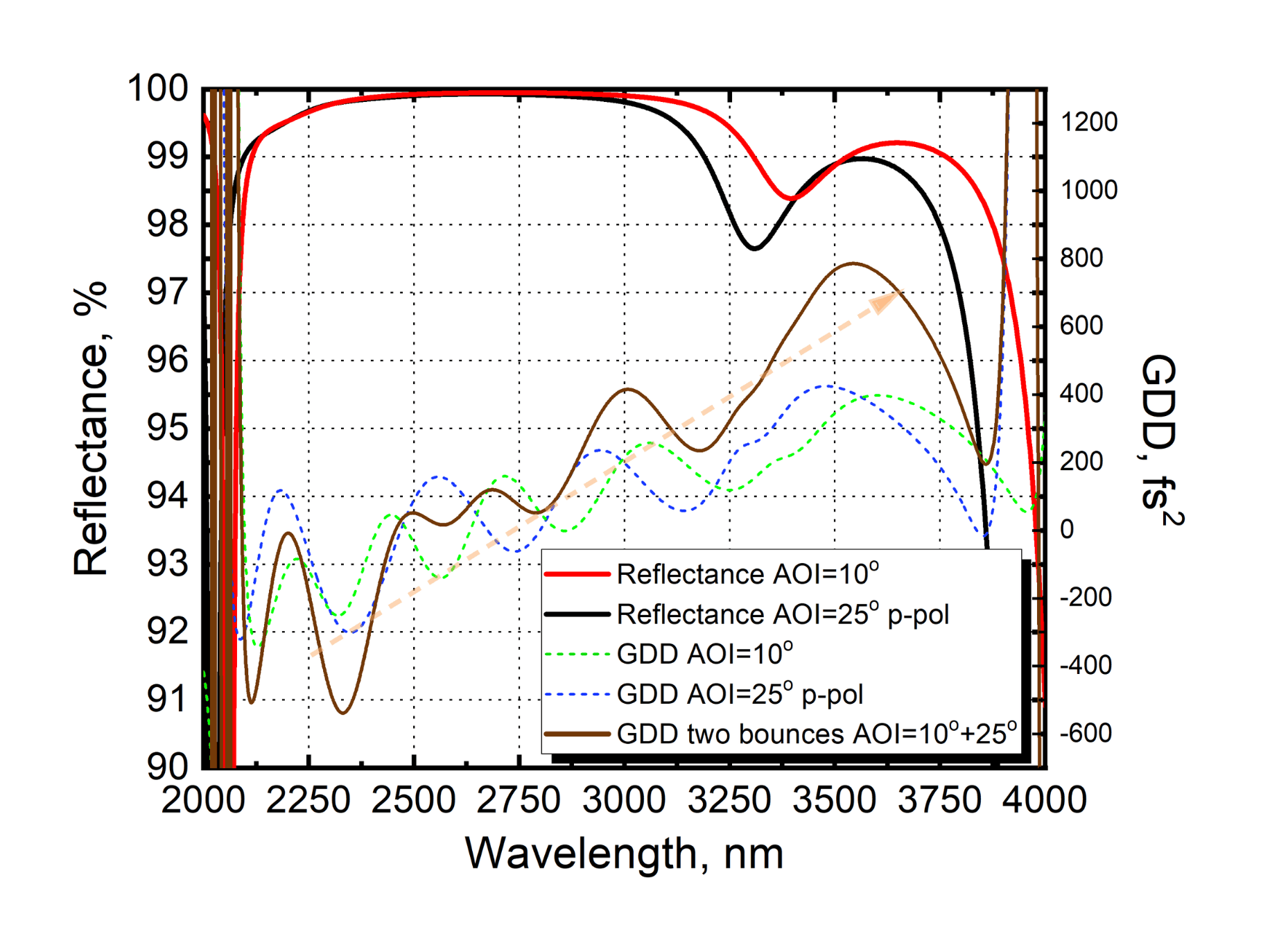 The produced mirror exhibits an average reflectance of R>98% over the 2150-3700 nm wavelength range and 0-25° angle of incidence for p polarization. As targeted in the problem description, the key feature of this mirror is its GDD value that is gradually increasing from -300 fs² at 2150nm to 300 fs² at 3750 nm. By using this mirror at two different angles (10° and 25°) GDD oscillations can be somewhat suppressed, leading to smoother spectral phase response. Theoretical reflectance and GDD curves of the mirror are depicted in Fig. 1.