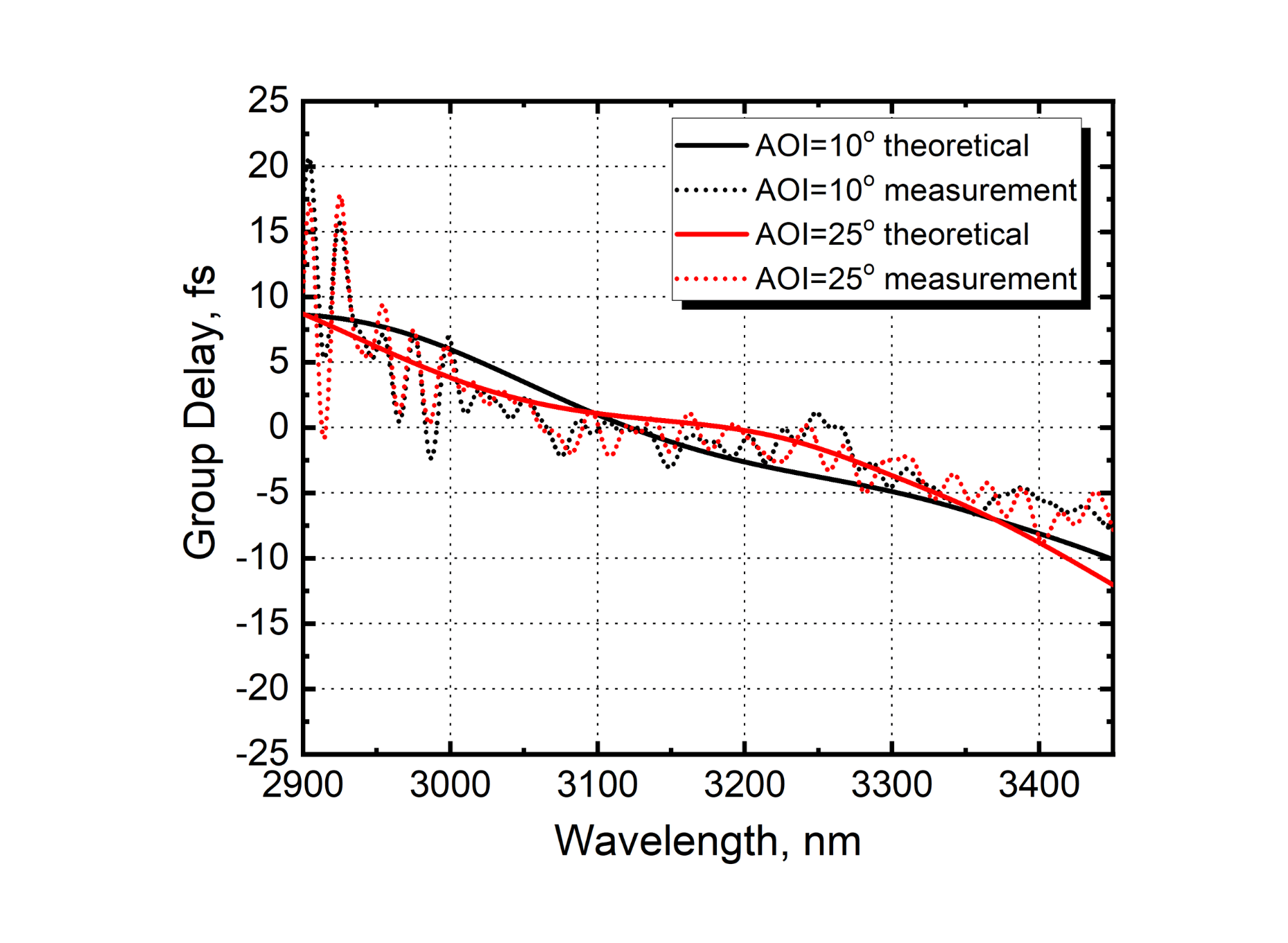 theoretically calculated and measured group delay curves is shown in Fig. 2. The SRI measurements show good agreement between calculated and measured GD values at both 10° and 25° angles.